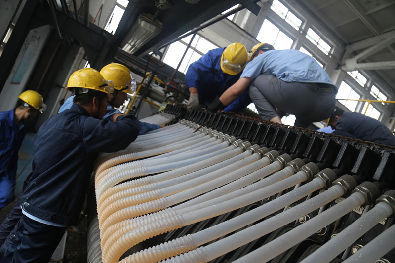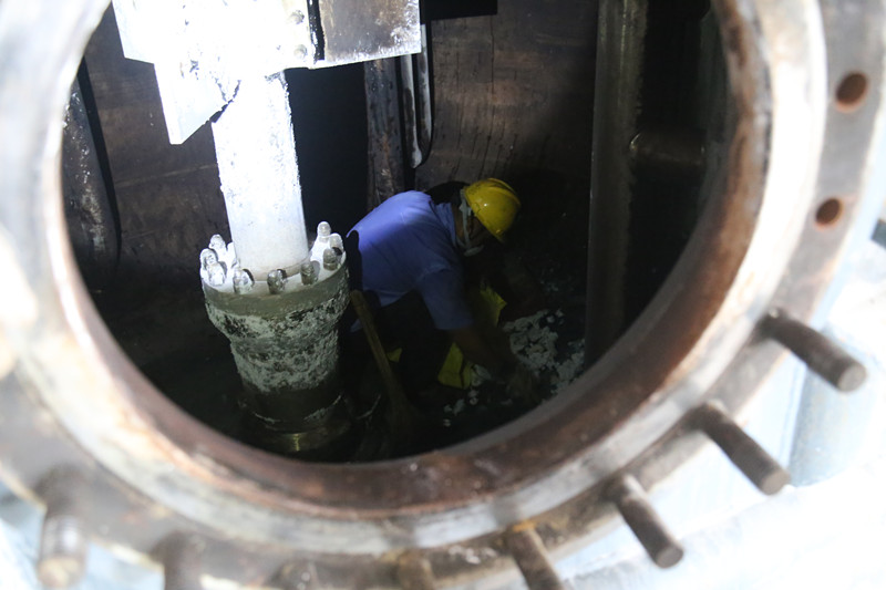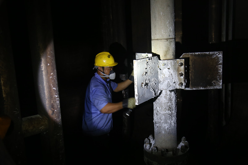 本次大修完成了342项检修任务,成了21项技改,重点完成了化工一线、三线蒸汽管道改造,实现了蒸汽的直供;完成了氯气大回流管道改造,消除了电解装置急停时,氯气回流量不足的工艺隐患;完成了氢压机进出口管道改造,消除了氢压机运行时震动大的安全隐患;完成了单体贮槽出口管道改造,避免了聚合一二期进料时相互之间的影响。对电解二期V-2007A阴极高位槽及氯压机转子进行了更换处理;对压力容器探伤检测中发现的二期聚合釜和一期出料槽出现的裂纹,进行了整改,消除了设备运行隐患。