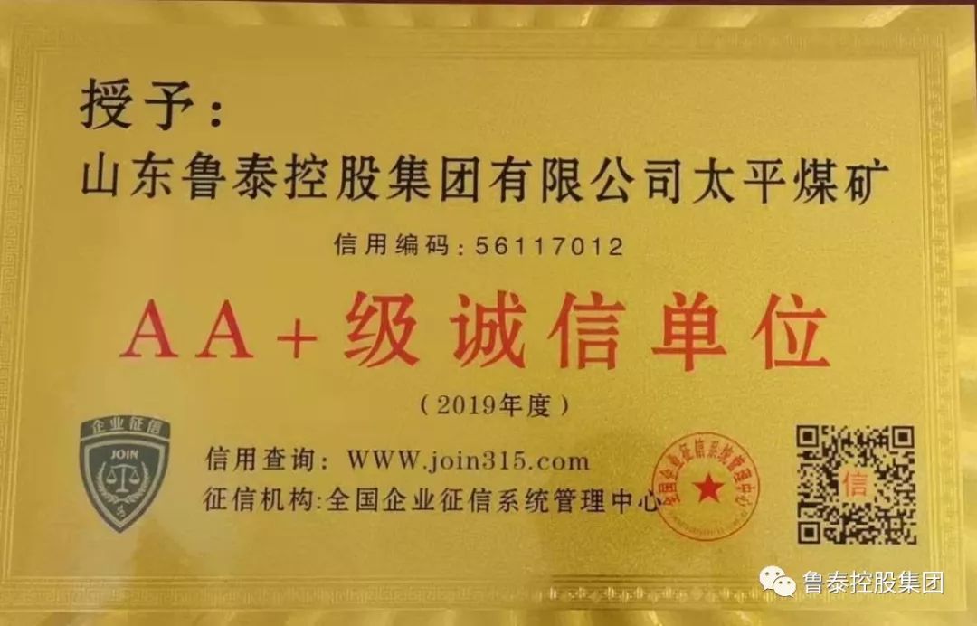近日,太平煤矿荣获全国企业征信系统管理中心授予的2019年度“AA+级诚信单位”称号。这是继2017、2018年度被评为“立信示范单位”之后荣获的又一殊荣!