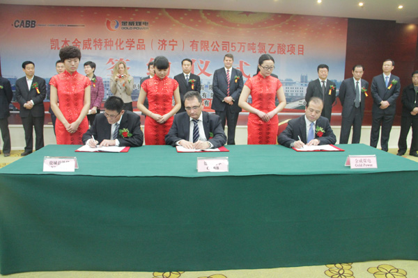 3月7日,金威煤电公司、德国CABB公司以及金威华盛公司在鱼台县观鱼台贵宾馆四楼大会议室共同签署,成立合资企业生产氯乙酸产品的合作谅解备忘录。这标志着,乐鱼官网注册煤业公司真正迈出了走向国际市场,参与国际合作的第一步,是企业发展的重大突破。市委常委、市政府常务副市长刘中会出席签约仪式并致辞。