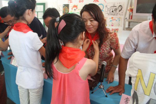 最后,孩子们为给予他们关怀的爱心人士们带上了红领巾并道了一声谢谢。