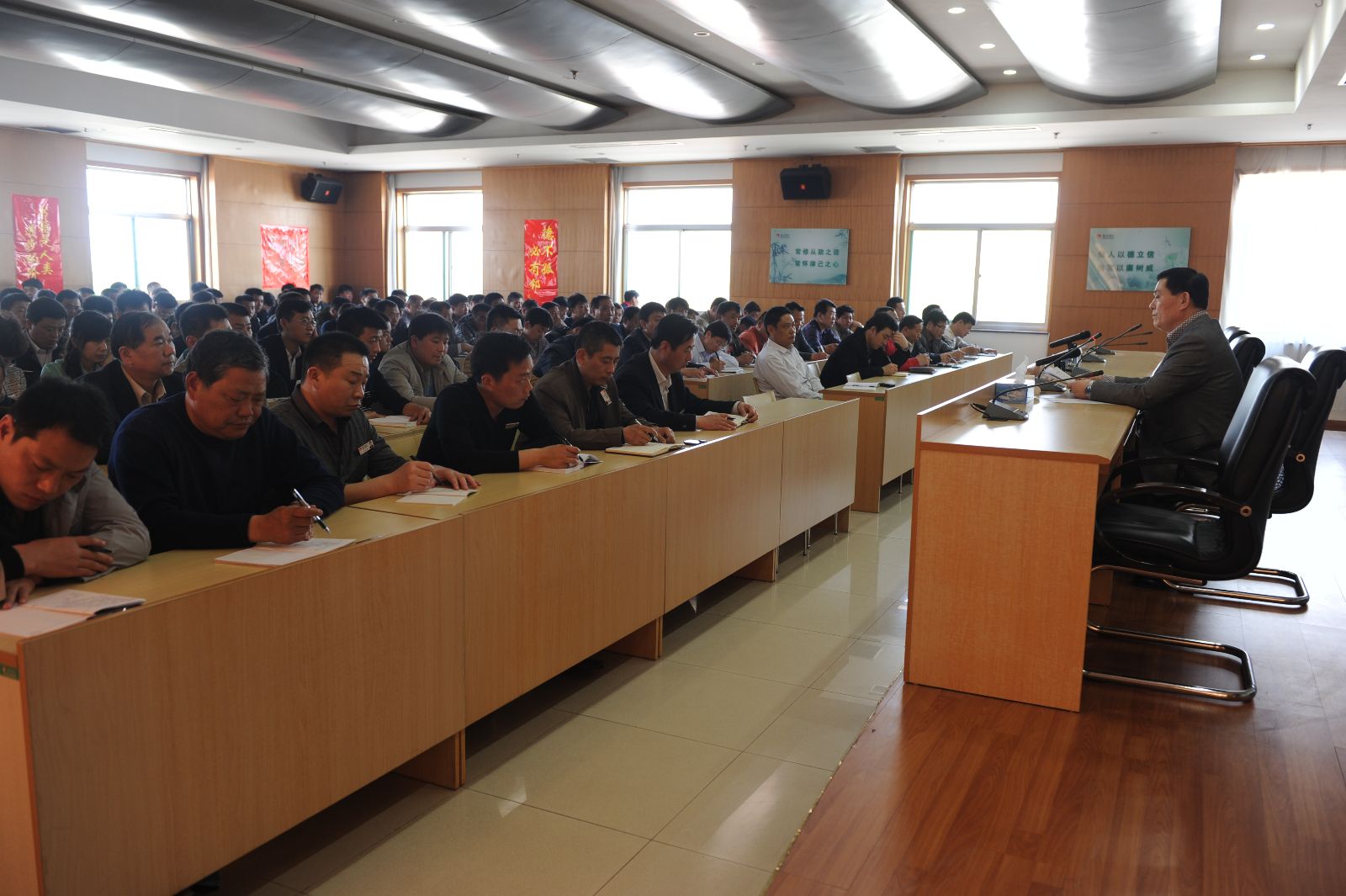 堂课一开始,高书记首先强调了教育实践活动的主题、总体要求、指导思想和目的。结合当前社会,解释了为什么我们党要开展群众路线教育实践活动。随后从保持党员的先进性、坚持党员的理想信念、牢记党的宗旨、严明党的纪律四个方面详细阐述,认真讲解,1个多小时的讲课时间,会场不断传来热烈掌声。