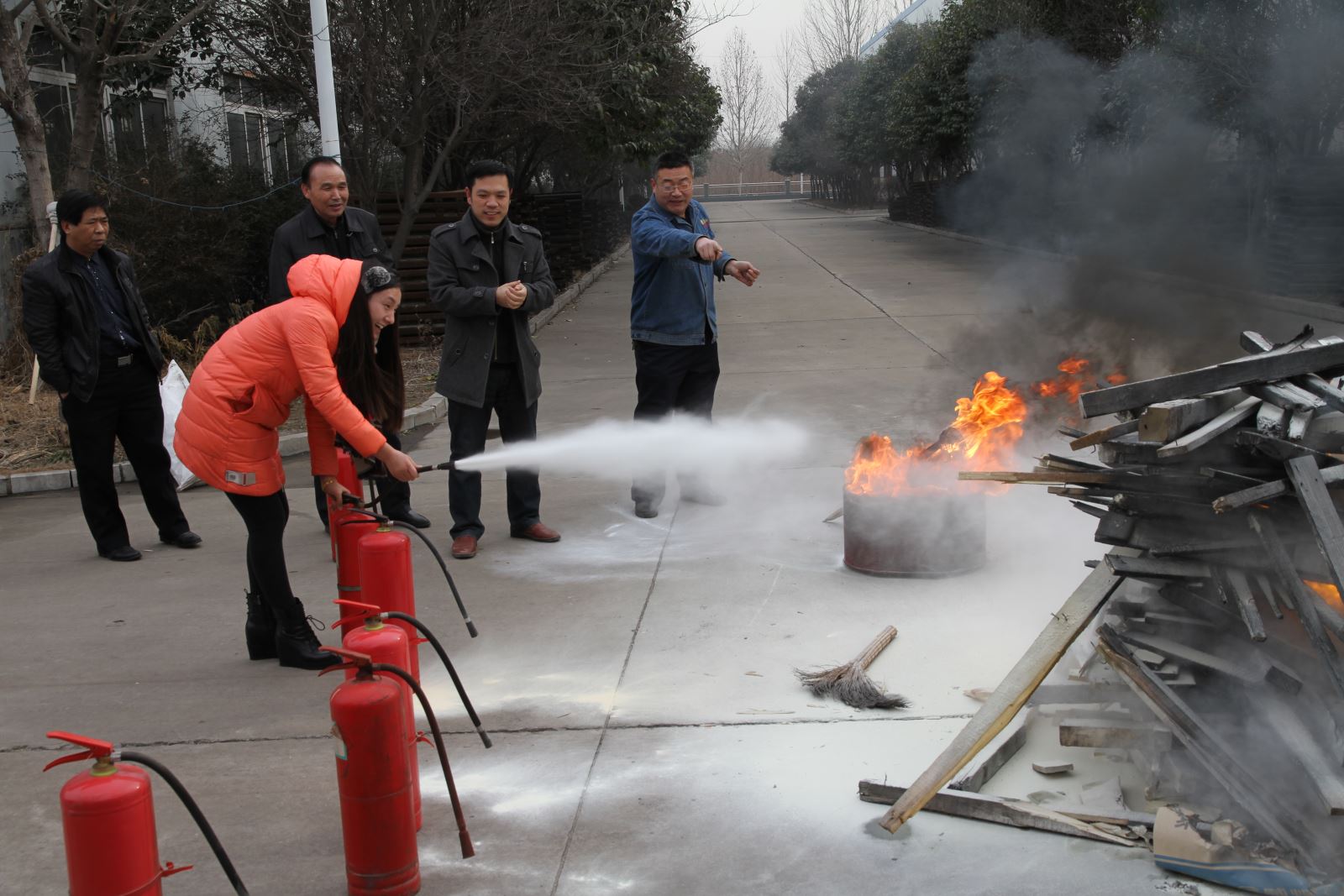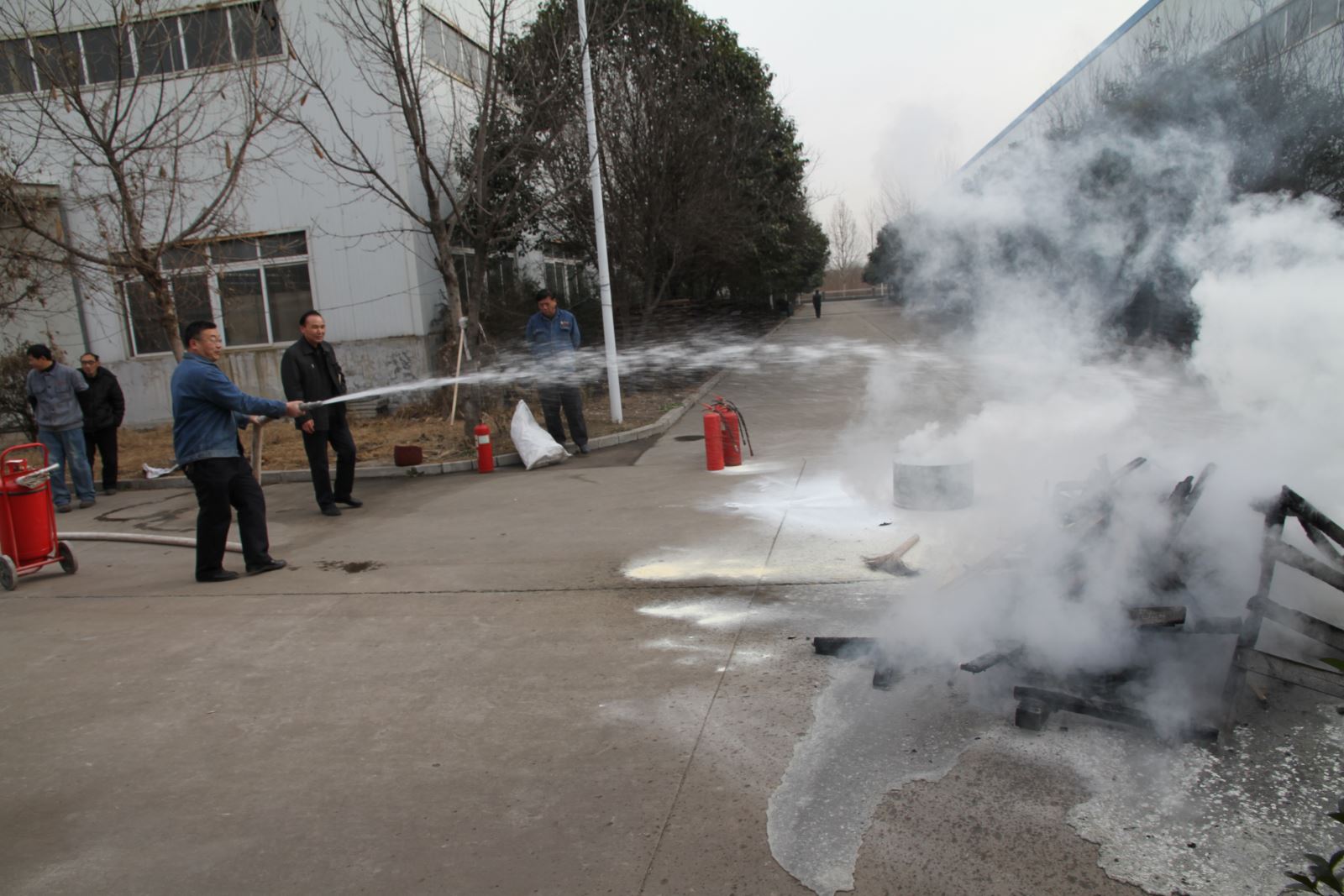 根据物流公司总经理李贻久安排,元月六日上午10时,在人和公司维修车间西侧,物流机关各部门及人和公司员工40多人整队参加消防演练。根据《消防演练方案》,首先有人现场向总指挥张宝阳汇报火情。张宝阳通知人和公司董事长李晶启动火灾应急预案,人和公司总经理蒋余凯开始组织消防演练。现场进行了逃生避险教育演练、干粉灭火器使用灭火演练和消防水带灭火演练。通过演练进一步在职工中普及了消防知识,锻炼了对灭火器的实际操作能力,提高了全员消防意识。