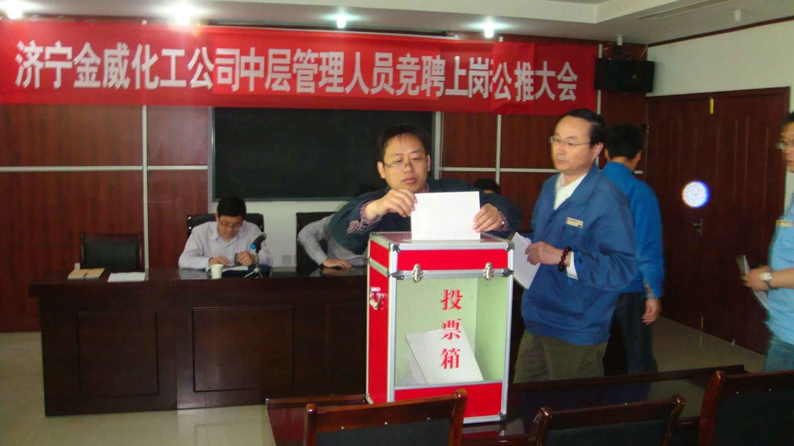 本次竞聘共分自荐报名、资格审查、公开推荐、确定拟任职人选和演讲答辩职位人员、演讲答辩、组织考察决定、任前公示、聘任等8个程序。5月8日,金威化工公司组织召开了中层干部竞聘上岗动员大会。副总经理陈海天主持会议,吴艳蕊副总经理传达了公司《关于做好中层管理人员竞聘上岗工作的通知》和《关于公司总经理助理级及中层正职管理人员竞聘工作实施方案》,总经理申玉海作了动员讲话。