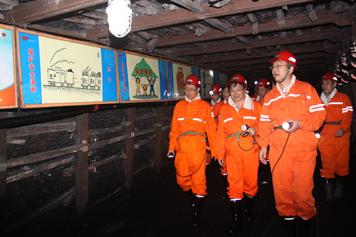 周凤文首先实地察看了太平煤矿调度指挥中心,通过监控系统查看矿井运转情况,检查领导干部值班带班及当班下井人员情况,询问矿井生产能力、执行276个工作日制度等情况。通过矿用小灵通与井下带班管理人员通话交流,询问现场安全生产情况,向奋战在一线的煤矿工人送去市政府领导的亲切关怀,要求他们要切实做好安全生产各项工作。
